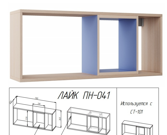• Полка состоит из внешней конструкции и внутреннего элемента СИНЕГО цвета, который делает полку не только интересной, но и придаёт дополнительную жёсткость конструкции и воспрепятствует прогибу в центре. Полка является универсальной, внутренний элемент может располагаться с любой стороны.
