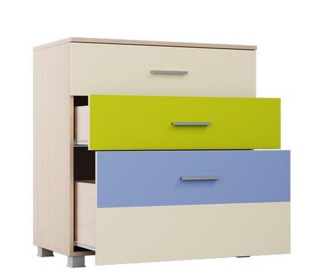 • Комод состоит из двух небольших взаимозаменяемых выдвижных ящиков, цвет фасадов Бежевый и ЛАЙМ и одного глубокого выдвижного ящика, фасад на котором сборный, состоящий из двух фасадов, цвет Синий  и Бежевый.